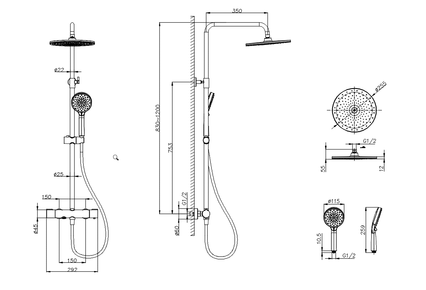 产品配置:10寸圆形顶喷、4.5 寸三功能手持花洒