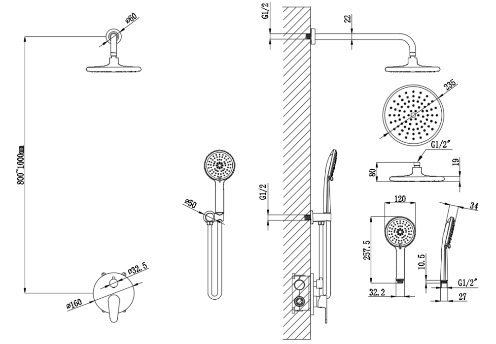 产品配置:235mm圆形顶喷、三功能圆形手持花洒