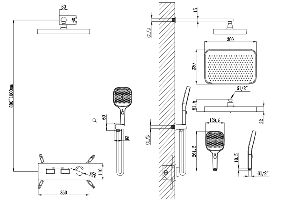 产品配置:14寸方形顶喷、三功能方形手持花洒